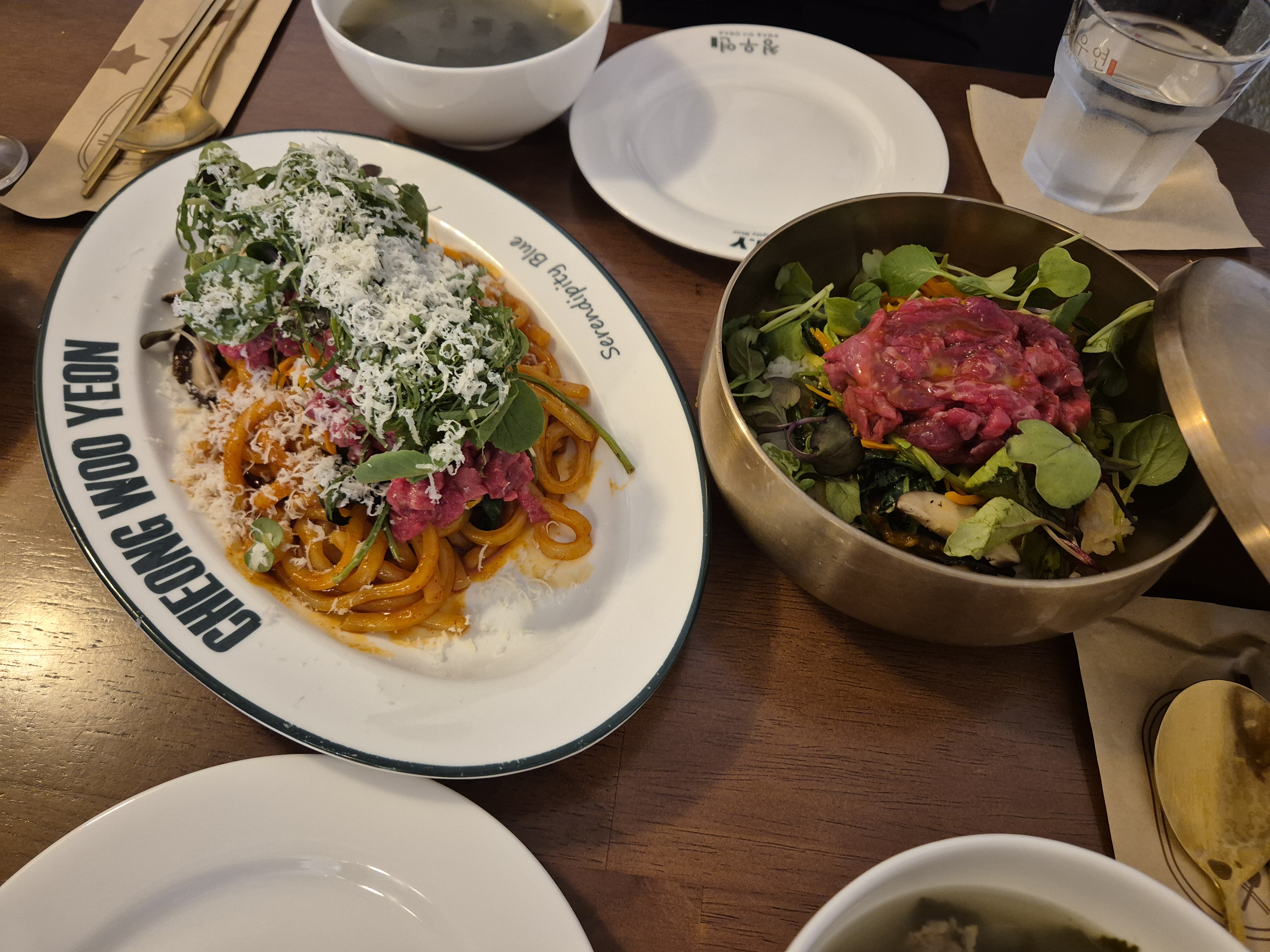 우동 면발의 쫄깃함과 차갑게 준비된 한우 육회가 의외로 잘 어울리더라고요.