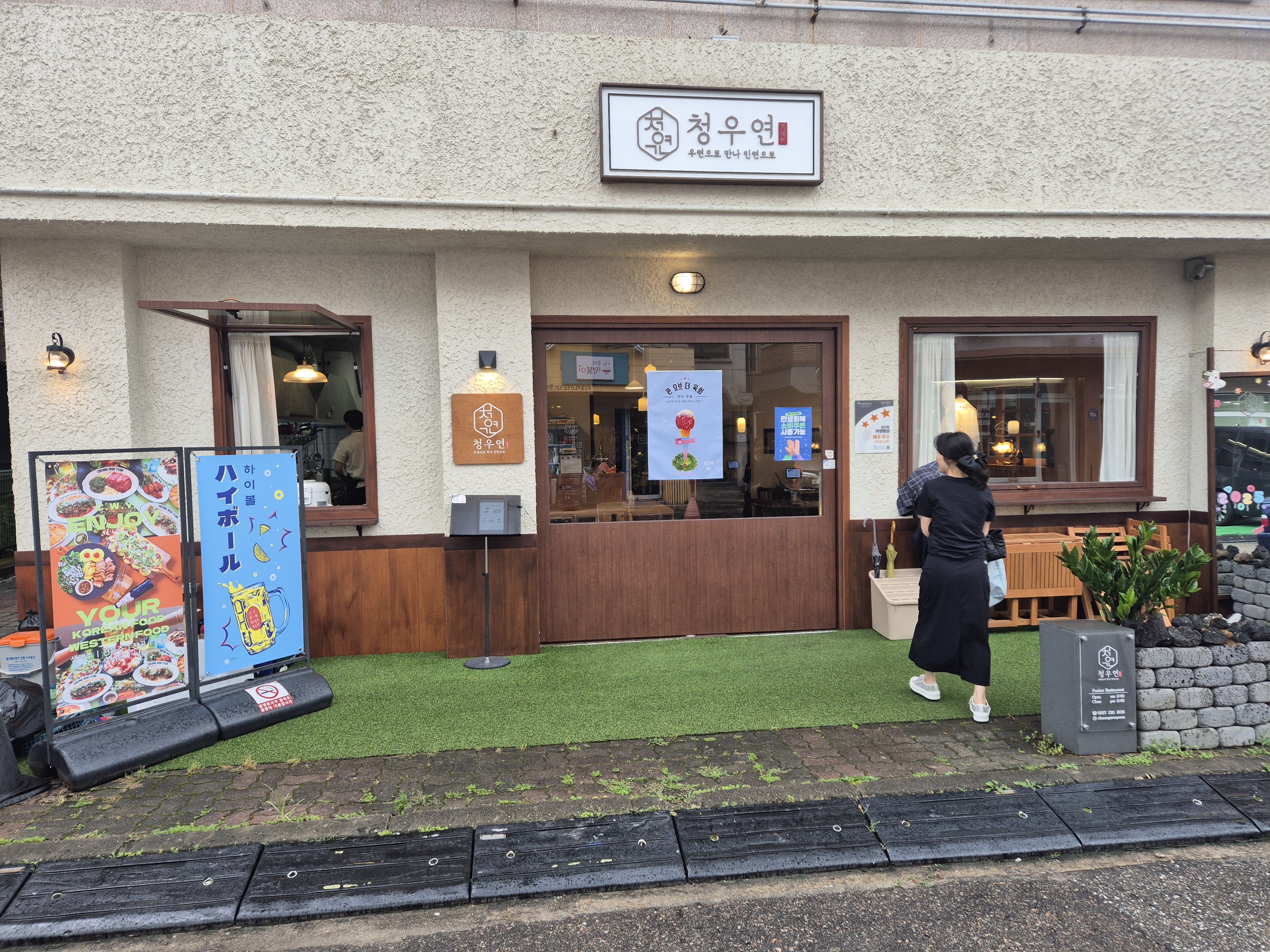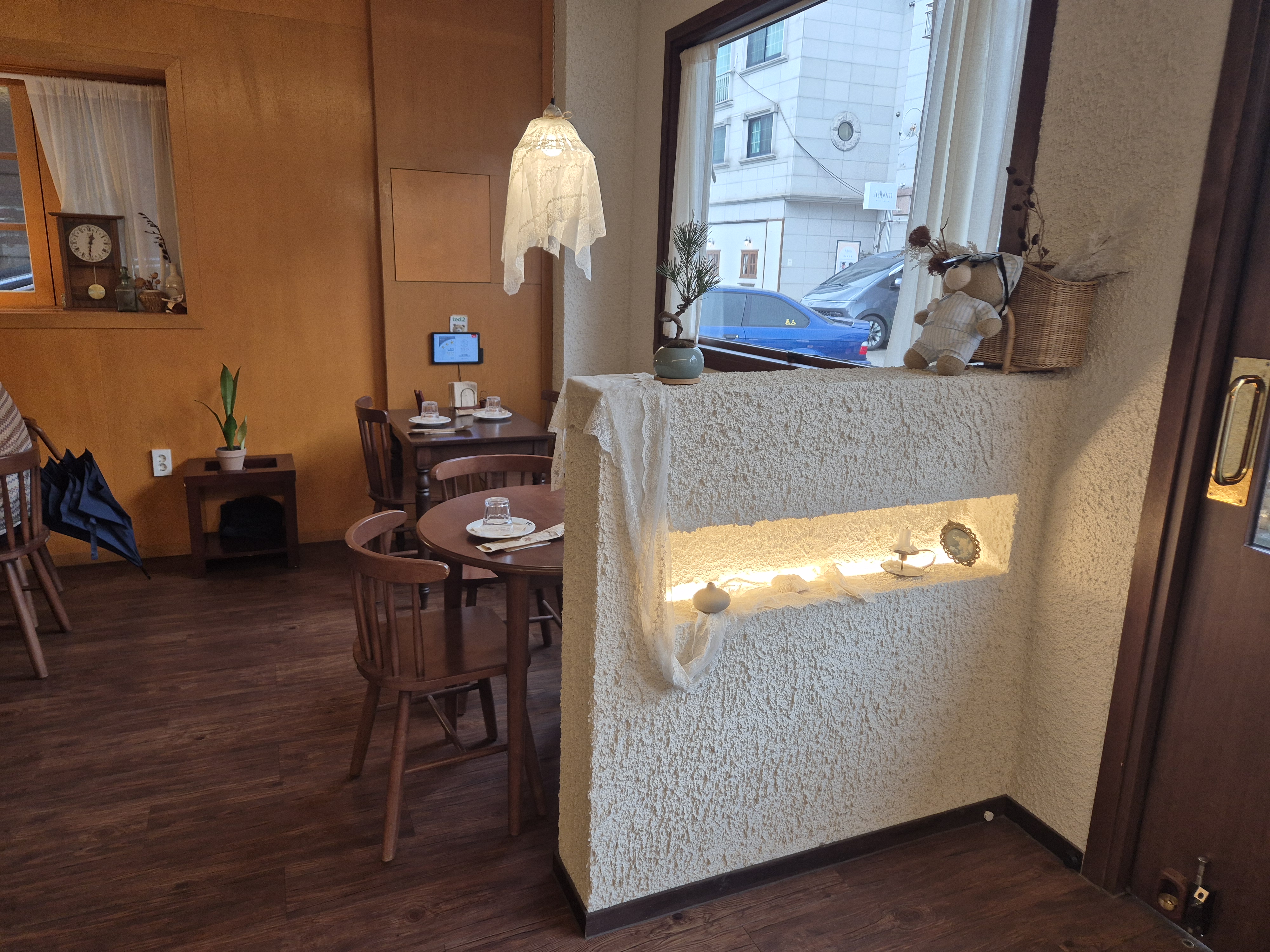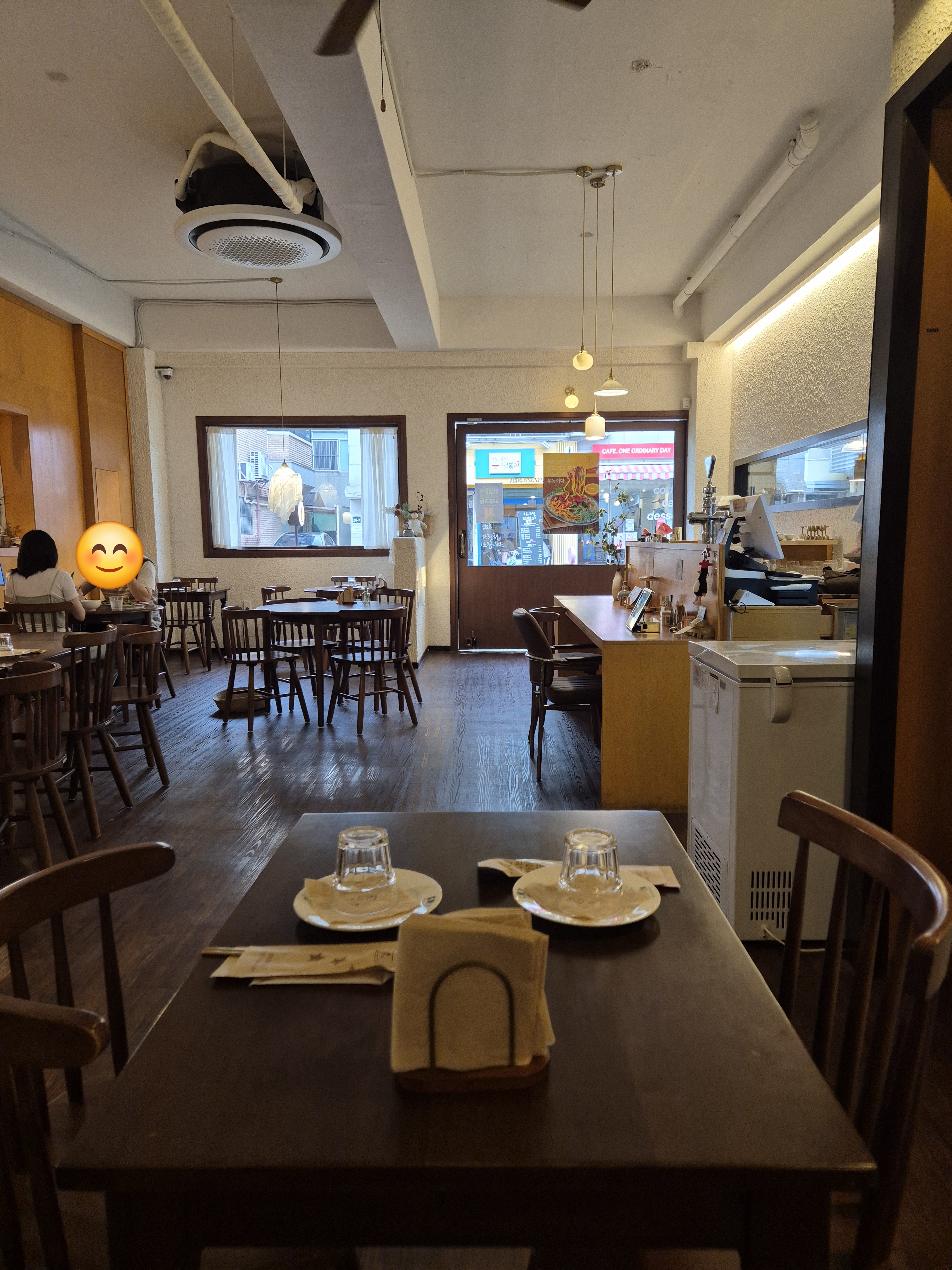 가게 외관은 깔끔하고, 내부는 따뜻한 조명과 단정한 테이블 배치로